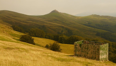 Le reste de l’étape se résume en un passage en sous-bois de hêtres ou de pins, des passages par d’immenses étendues d’herbes, longeant d’interminables clotures rectilignes que l’on suit sur plusieurs km, des cols, donc des postes, beaucoup de postes de palombes. Quant à la population, depuis que je suis entré en Pays Basque je ne croise (heureusement) plus grand monde, aujourd’hui je croiserais des brebis, des vaches, des pottoks, un milan royal, des vautours, un bébé salamandre, des cochons, et un tu-pues-le-chien. Le dernier animal que j’ai croisé était un hooligan anglais : quand j’ai levé la tête pour saluer le marcheur que j’allais croiser, j’ai vu comme il s’était approché de moi, se dirigeant directement vers moi et c’est là que sans explication aucune il m’envoie une droite entre l’épaule et la poitrine, moi j’ai continué sans demander mon reste et j’ai demandé dans la pension où je loge ce soir si un gars bizarre y avait dormi cette nuit et il s’avère que oui, un anglais taciturne, manifestement pas pugniturne ! Moi-même animal rancunier, j’ai effectué un signalement auprès de la police (dans le cuartel militaire d’Elizondo, qui n’usurpe en rien le nom de cuartel tant il ressemble à un camp retranché en guerre contre le Pays Basque qui l’entourne), j’ai aussi appelé l’auberge à laquelle il était susceptible de dormir ce soir. Si son souvenir continue à m’emmerder, je continuerais à appeler les refuges et auberges par lesquels il devrait passer, ils n’aiment pas trop les gens violents et la xénophobie latente de l’espagnol est facile à réveiller (surtout en Aragon), le hooligan pourrait alors raconter à ses potes violents les mauvaises vacances qu’il aura passé, ça fera ça de moins dans nos contrées…